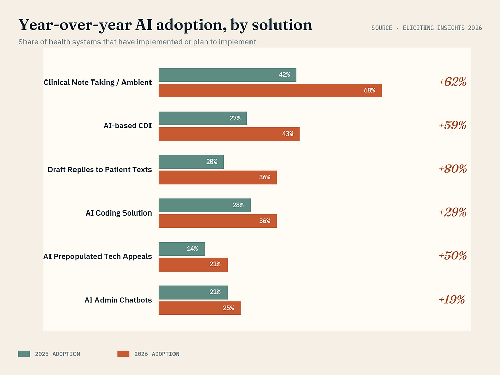 • Clinical note-taking and ambient listening: 68% adoption, up 62% YoY