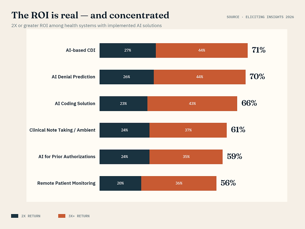 It would be easy to mistake this story for a cautionary tale. It isn't. Health systems that have implemented AI are, by and large, getting their money back — and often far more. Of respondents able to measure ROI, more than half report at least 2x returns on most categories.